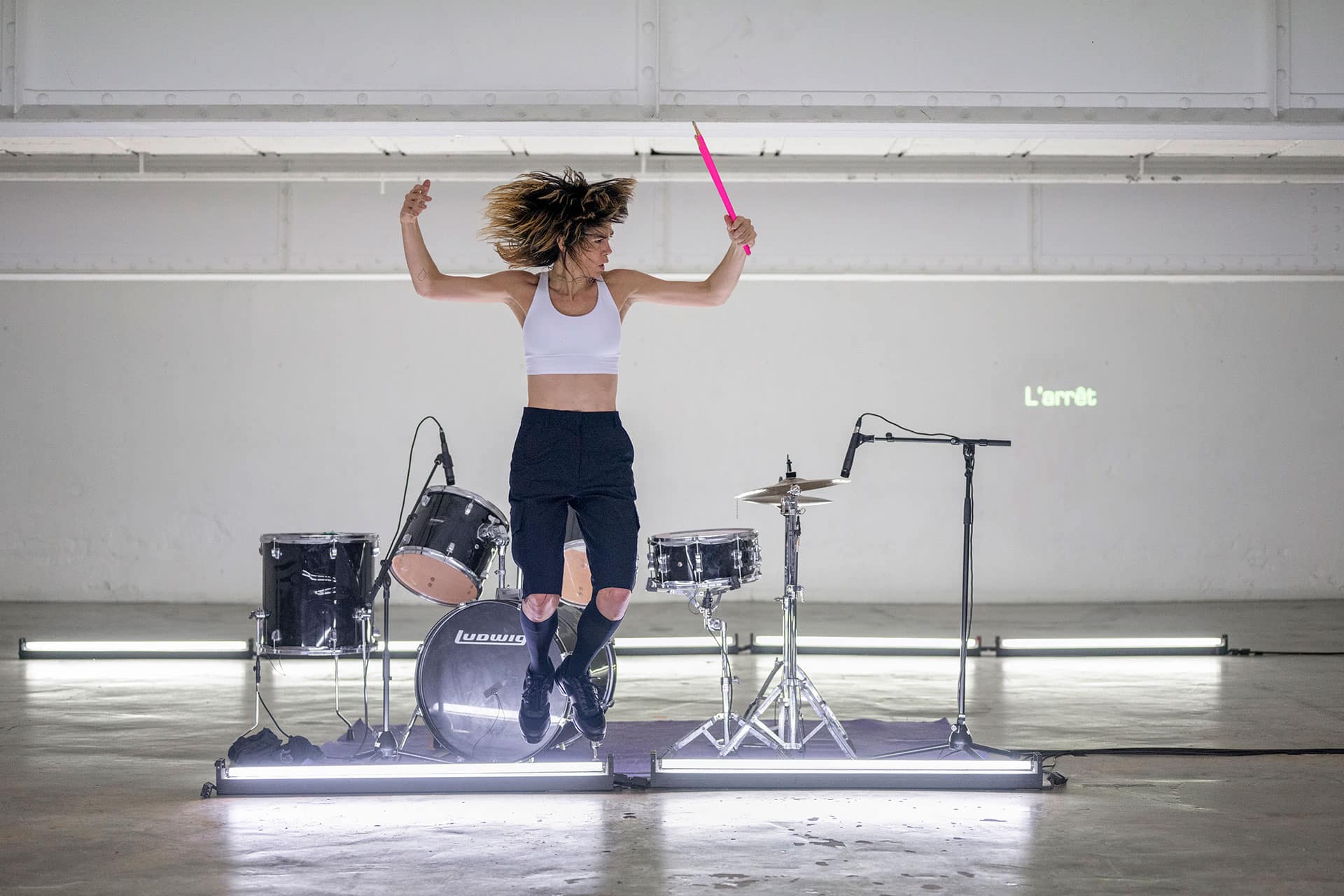 Baguettes rose fluo entre les doigts, Aina Alegre, comme prête pour le combat, s’élance dans un duo / duel avec...