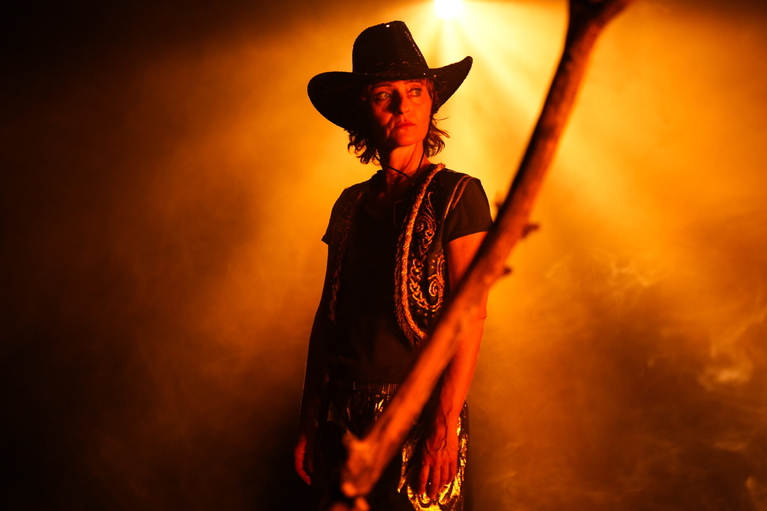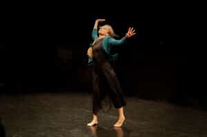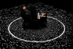 Dans la profonde obscurité du plateau, des sources de lumière intermittentes sculptent l’espace, tandis que se...