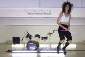 Baguettes rose fluo entre les doigts, Aina Alegre, comme prête pour le combat, s’élance dans un duo / duel avec...