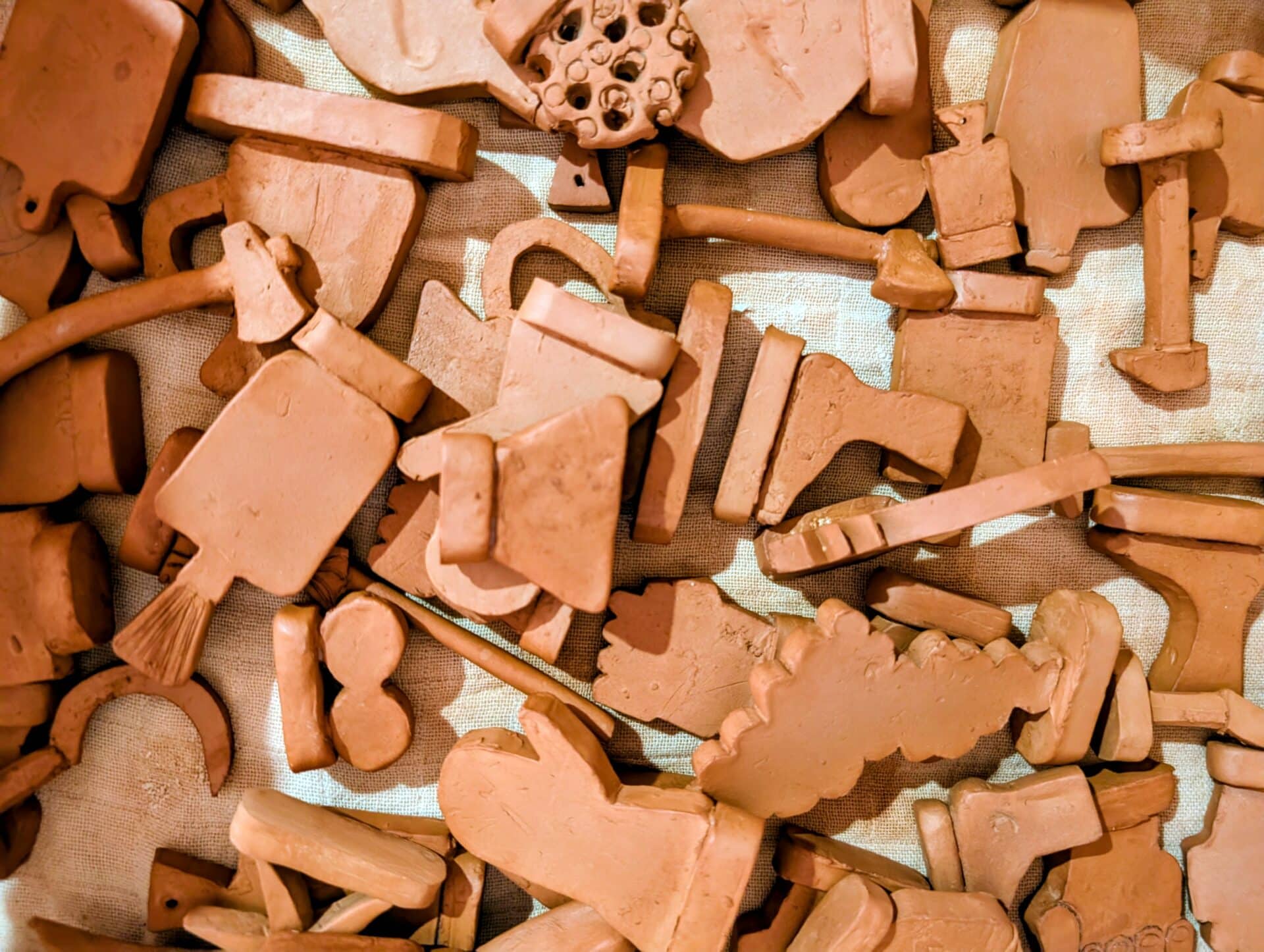 « Ces objets sont ceux qui m’entourent. Rassemblés, ils parlent de cueillette de plantes, de distillerie, des copains et copines bergers, paysans, brasseurs, menuisiers, potiers, pierraillers, enduiseurs, etc. Ce sont des objets intimes qui embrassent encore la main de l’Homme, qui parlent de son rapport à l’outil, au savoir-faire, aux plaisirs de faire et d’être en lien avec les matières, les techniques, l’environnement, le milieu, le vivant. Des santons, je retiens à la fois une certaine description de la Provence, au travers des métiers, des rôles de chacun·e, mais aussi et surtout le rituel : collectionner, cueillir le décor, la mousse, les écorces, et ajouter les personnages. J’aime que tout soit au même niveau : les arbres, les plantes, les objets, les gens, les animaux, les outils, parce que tout ça raconte ! » — Bettina Henni