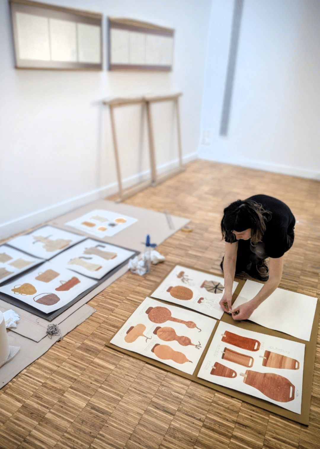 Gròs Santoun est issu du livre éponyme de Bettina Henni publié par Fotokino. Petite encyclopédie intime de son quotidien, elle y a collecté par le dessin des objets et figures liés aux traditions populaires, à la nature, à l’artisanat et à la vie paysanne en Provence. Chaque objet dessiné est accompagné de son nom en provençal : c’est un peu comme un catalogue de santons ! Un catalogue d’objets qui nous plonge dans l’imaginaire de la Provence, celle des artisan·es, des cueilleur·ses, des paysan·nes…