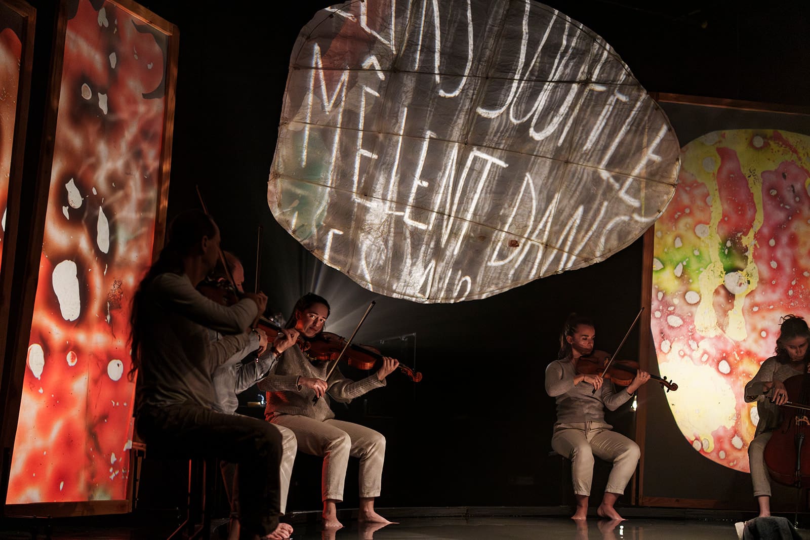 La Nuit transfigurée, poème de Richard Dehmel (1896) mis en musique par Arnold Schönberg avant qu’il n’opère son tournant atonal, est un monument du romantisme. S’y retrouvent tous les thèmes chers à ce mouvement artistique du début du XXe siècle : la force de l’amour en dépit des obstacles, mais aussi et surtout les relations avec la nature à laquelle on prête autant de sentiments qu’aux humains. La délicatesse du théâtre d’ombres développé par Aurélie Morin s’offre ainsi comme le plus bel écrin pour l’adaptation d’un tel chef-d’œuvre. Manipulant en direct des matériaux, jouant autant du noir et blanc que du chatoiement de couleur des peintures projetées, chorégraphiant le mouvement de figurines comme celui de la lumière, deux comédiennes-marionnettistes glissent de la figuration à l’abstraction. Accompagnées du détonnant sextuor à cordes de l’ensemble La Camerata, dirigé par Gaël Rassaert, ils donnent à voir les puissances invisibles qui peuplent les bosquets. À l’unisson, battent alors le cœur des amants et celui des éléments naturels qui les entourent et les protègent.