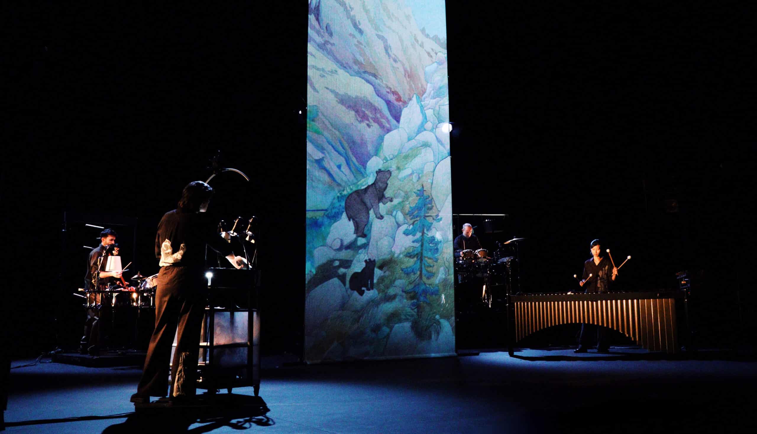 Au plateau, musique, voix off et dessin en direct se fondent. Des instruments de percussions classiques se mêlent à un dispositif électroacoustique pour faire vivre cette épopée. Un face à face entre l’Homme et l’Animal au dénouement aussi surprenant qu’inattendu. Une histoire profonde et passionnante.