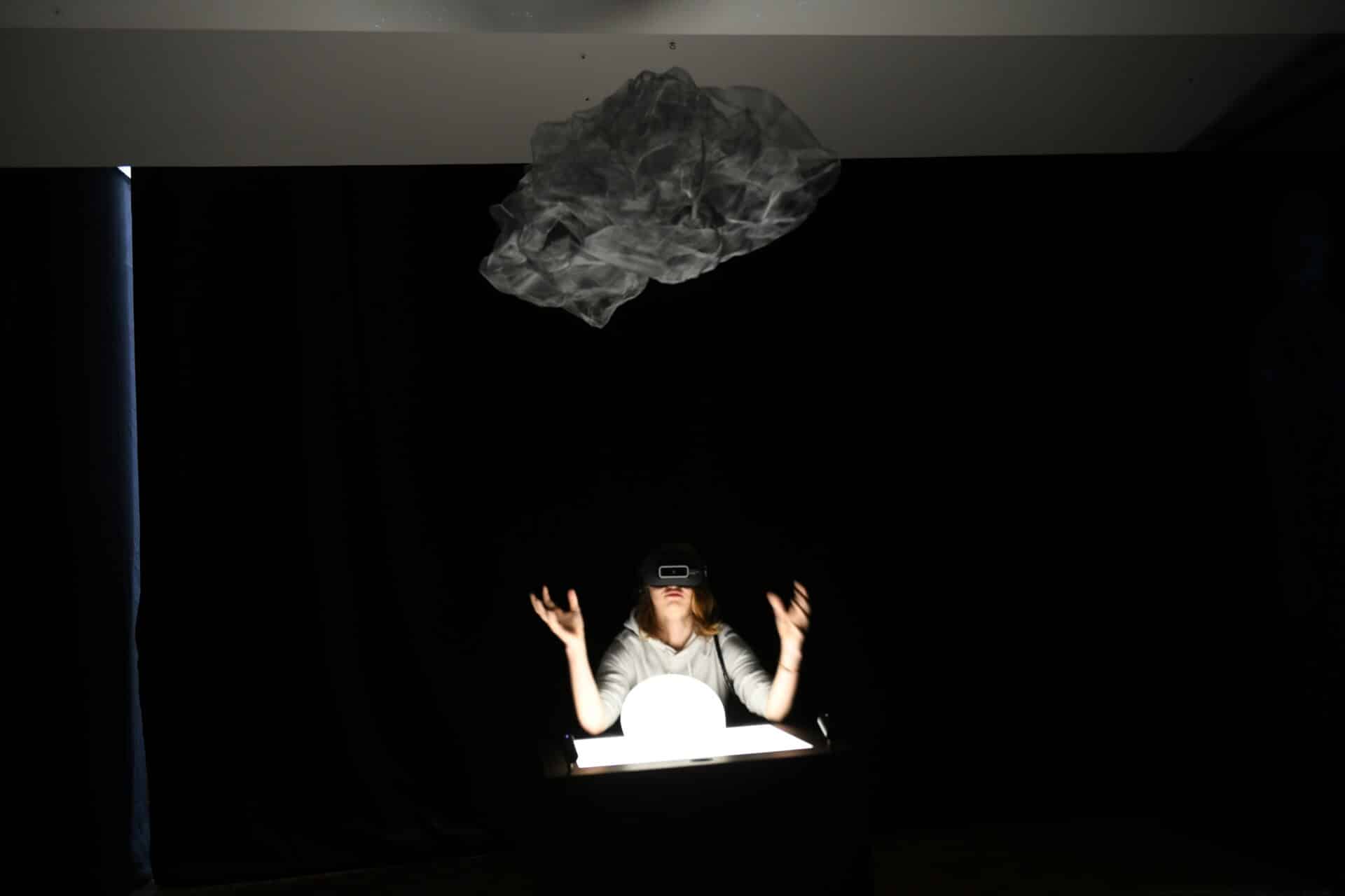 « L’image, immatérielle, mobile, agile, vient incarner cet imaginaire et ouvrir ces “objets à réaction poétique”. Les casques de réalité virtuelle sont des dispositifs technologiques qui peuvent être pris comme des machines à fantômes. Il y a quelqu’un qui nous regarde, qui danse, qui nous parle, qui apparaît et disparaît, bouge et se fige. Il y a quelqu’un, une ombre, un courant d’air. Ou des esprits de poussières insaisissables. Qu’est-ce qui fait le vivant ? »