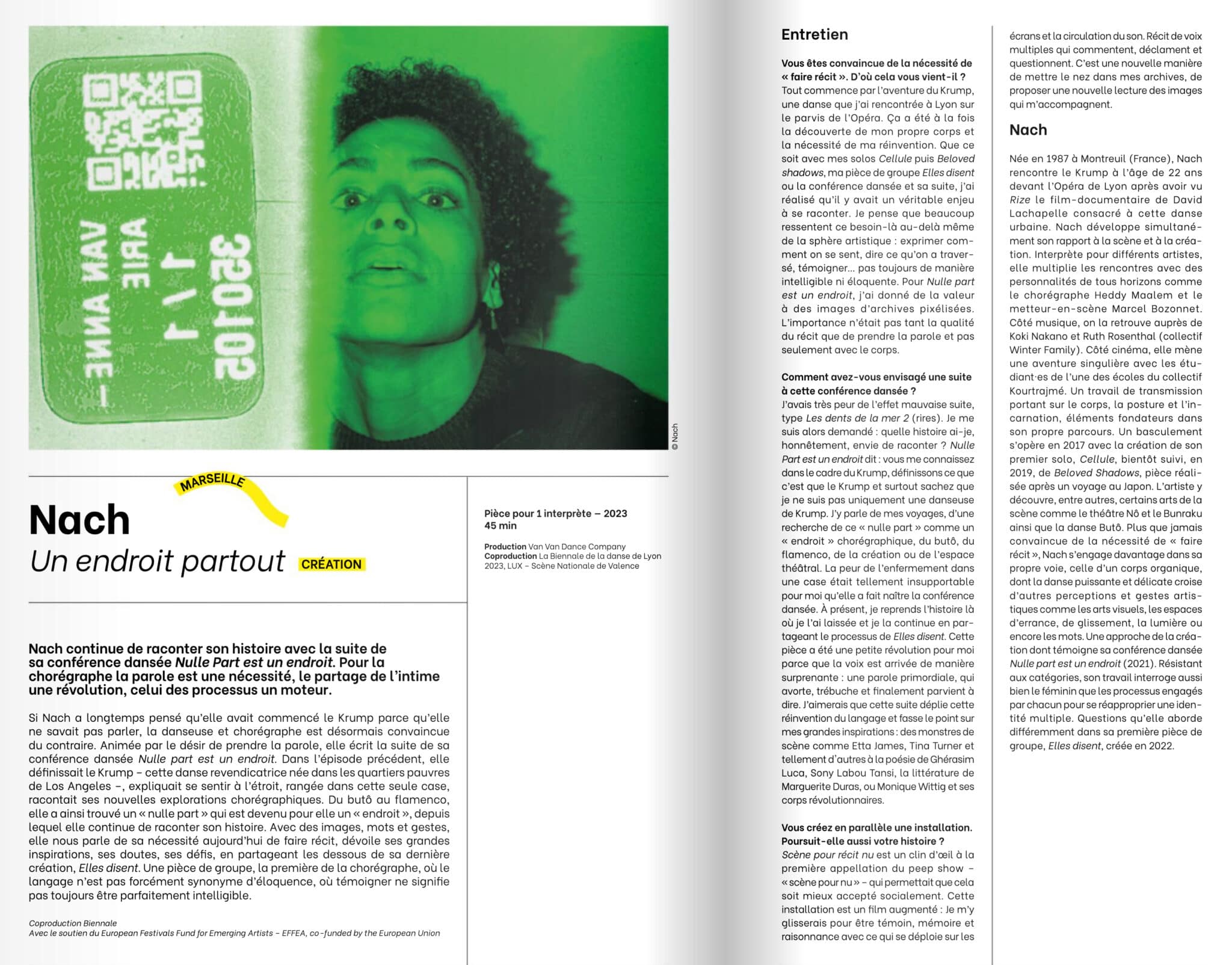 Si Nach a longtemps pensé qu’elle avait commencé le Krump parce qu’elle ne savait pas parler, la danseuse et chorégraphe est désormais convaincue du contraire. Animée par le désir de prendre la parole, elle écrit la suite de sa conférence dansée Nulle part est un endroit. Dans l’épisode précédent, elle définissait le krump – cette danse revendicatrice née dans les quartiers pauvres de Los Angeles –, expliquait se sentir à l’étroit, rangée dans cette seule case, racontait ses nouvelles explorations chorégraphiques. Du butô au flamenco, elle a ainsi trouvé un « nulle part » qui est devenu pour elle un « endroit », depuis lequel elle continue de raconter son histoire.