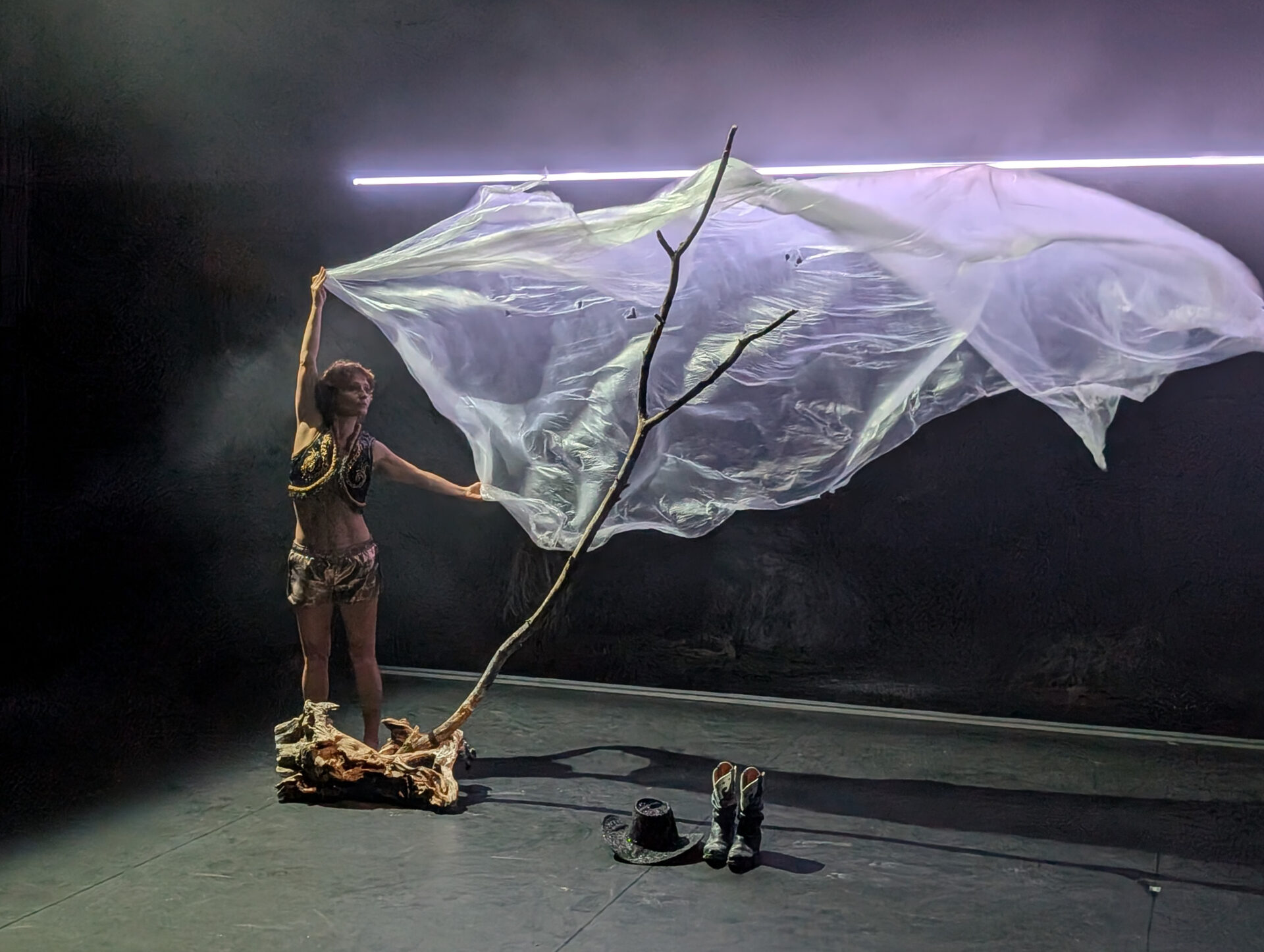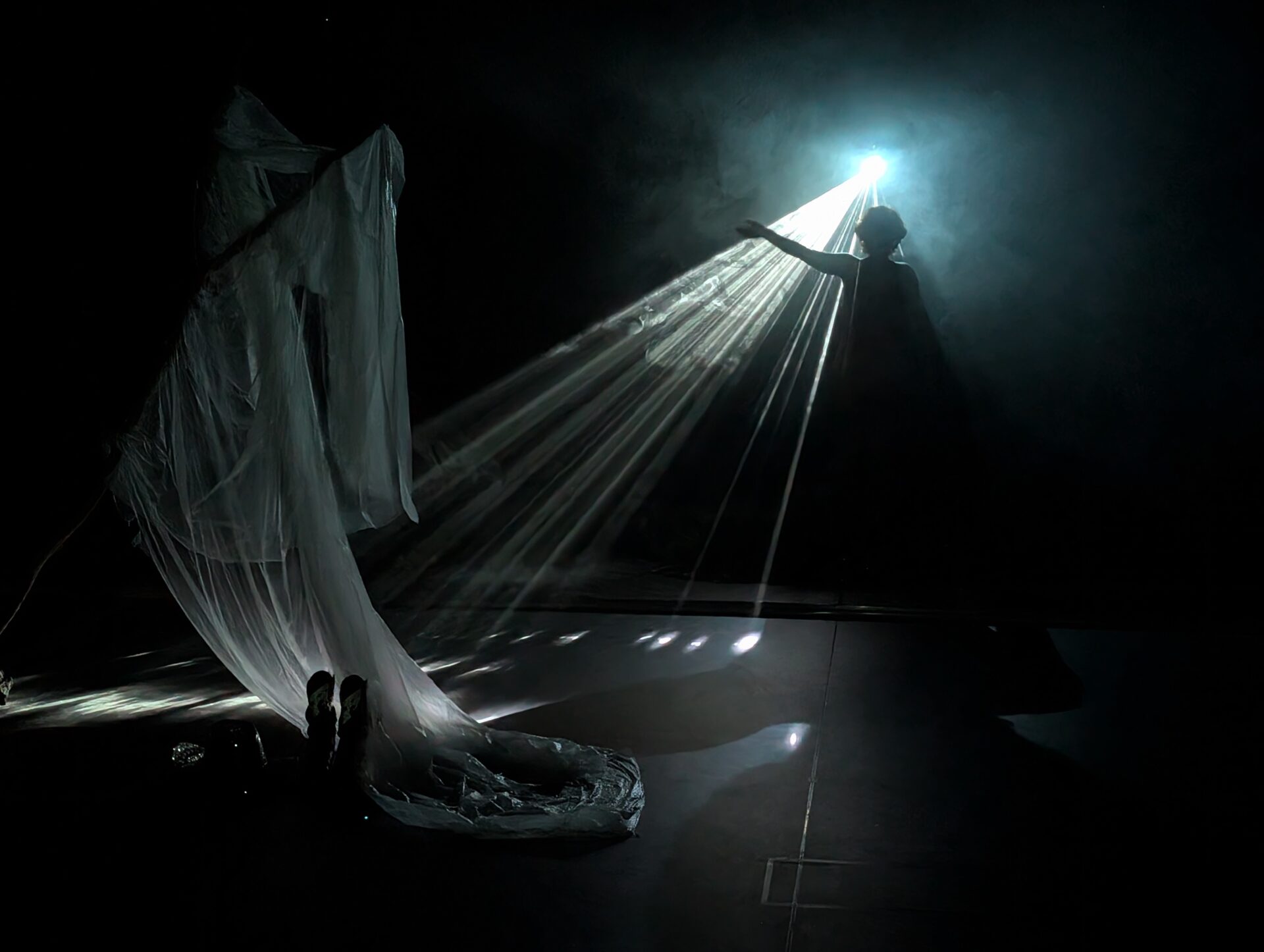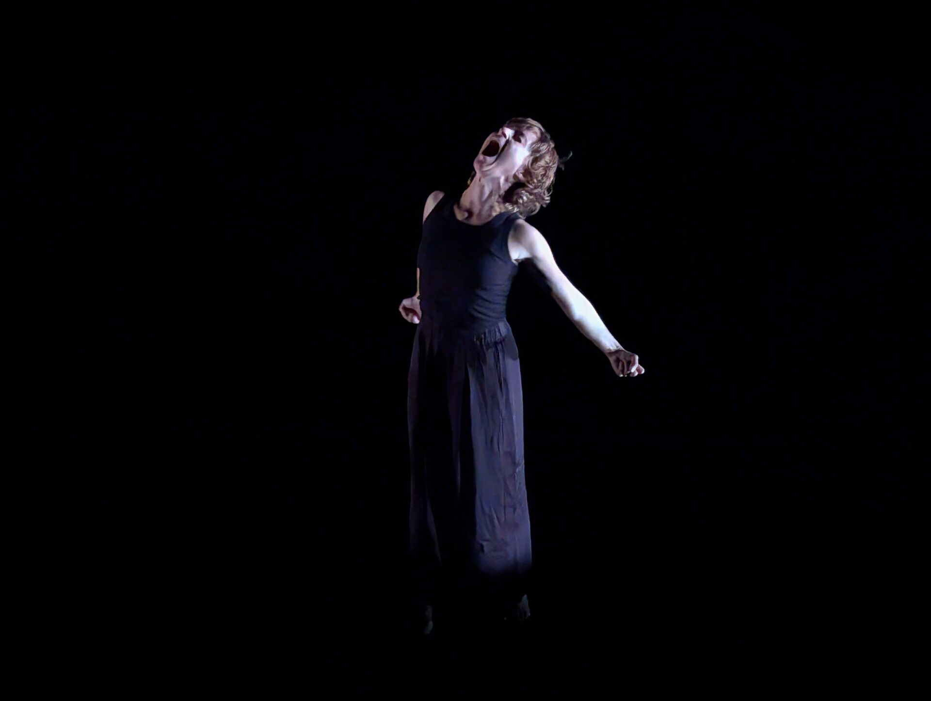 Dans la profonde obscurité du plateau, des sources de lumière intermittentes sculptent l’espace, tandis que se déploient en bande-son des échos d’un chaos lointain. Éclairée de temps à autre, une silhouette émerge avant de disparaître aussitôt. Ses mouvements ne se livrent que par fragments, invitant le spectateur à compléter dans son imagination les pièces manquantes pour recomposer la logique des gestes.