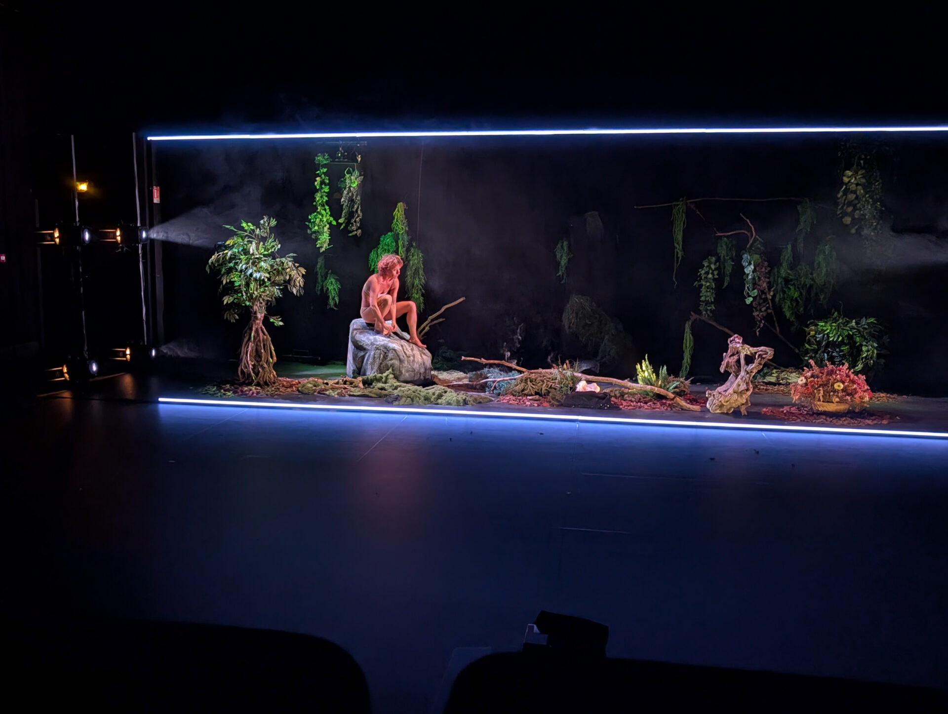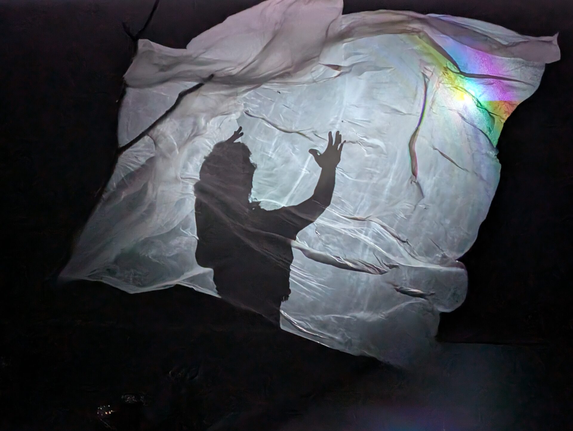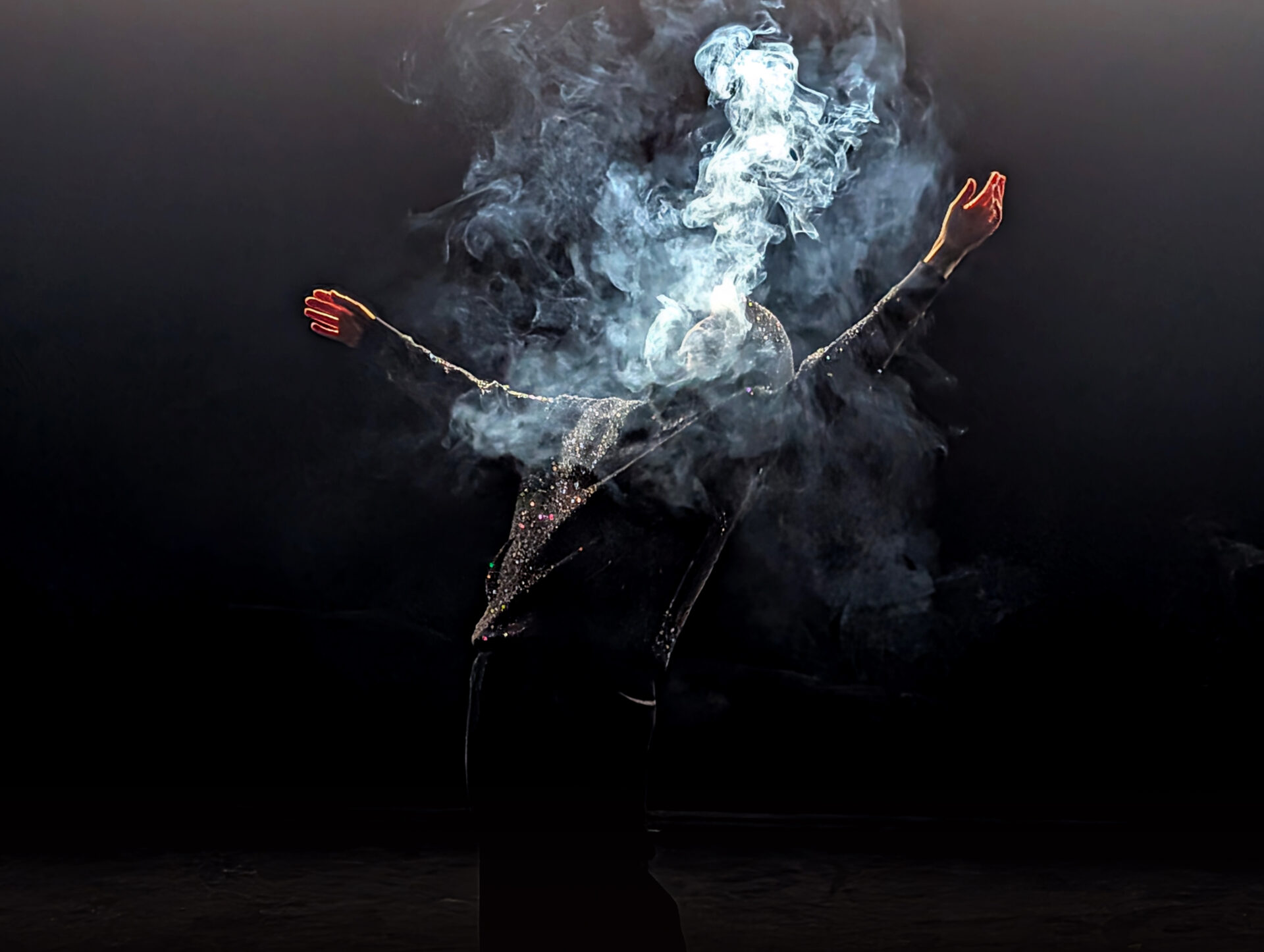 Dans la profonde obscurité du plateau, des sources de lumière intermittentes sculptent l’espace, tandis que se déploient en bande-son des échos d’un chaos lointain. Éclairée de temps à autre, une silhouette émerge avant de disparaître aussitôt. Ses mouvements ne se livrent que par fragments, invitant le spectateur à compléter dans son imagination les pièces manquantes pour recomposer la logique des gestes.