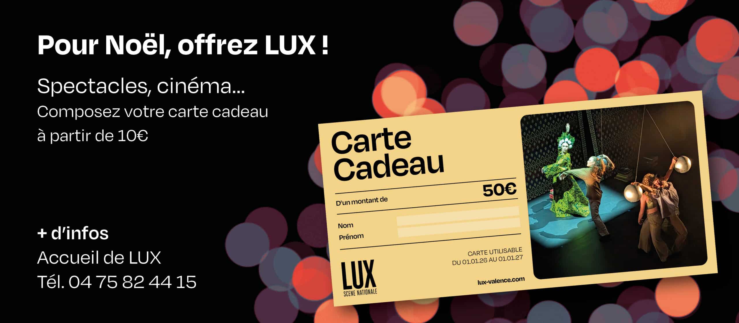 LUX, Scène nationale de Valence, propose une saison de spectacles chorégraphiques et musicaux, d’expositions et de films, ponctuée du festival Viva Cinéma. LUX est une maison artistique et culturelle à Valence où publics et artistes se rencontrent. Chaque année, des artistes associés sont accueillis pour des créations ou résidences. LUX mène aussi une large action culturelle à travers des ateliers et projets participatifs à destination du grand public, de la jeunesse, du public scolaire, enseignant et associatif.